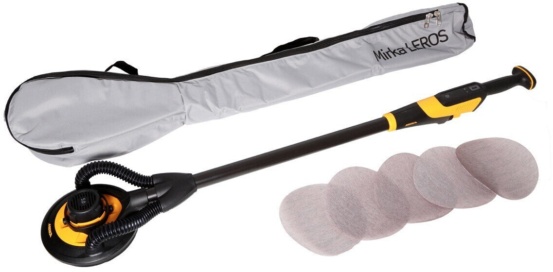 Dieser einzigartige Wand- und Deckenschleifer überzeugt mit nur 3,5 kg Gewicht und einem bürstenlosen Motor. Das geringe Gewicht ermöglicht dem Anwender ein Schleifen über längere Zeiträume ohne den Körper zu belasten. Ein weiterer Vorteil ist die 180 ° Flexibilität am Schleifkopf. Die Oberfläche kann von einem besseren Winkel erreicht werden, dies ermöglicht dem Anwender eine ergonomische Position. Mirka® LEROS hat eine exzentrische Bewegung, dank welcher die Maschine genau auf die Bewegungen des Anwenders reagiert. Eine praktische Tragetasche ist im Lieferumfang enthalten.